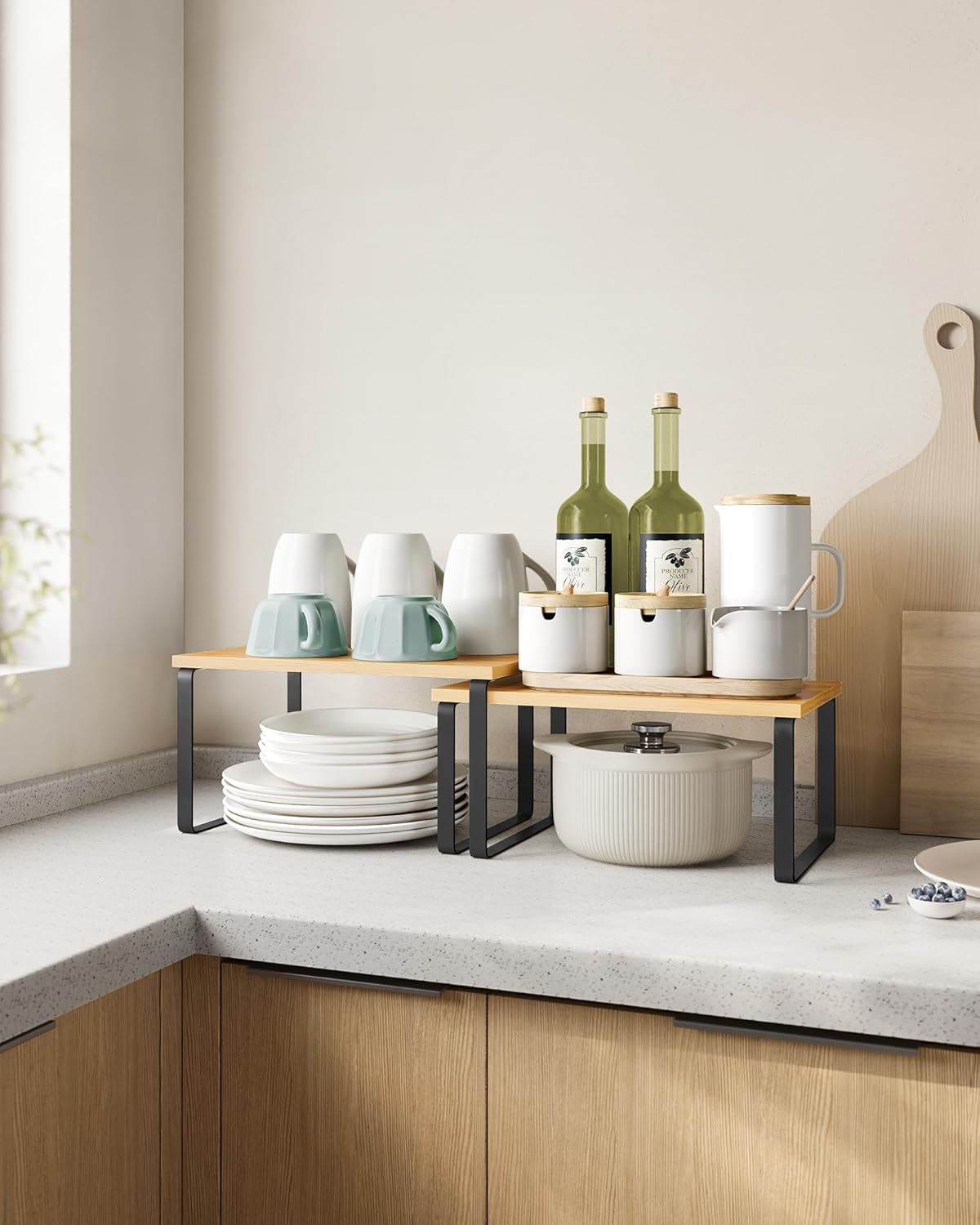 Introducing the SONGMICS Cabinet Organizer Shelf, a versatile and practical solution to declutter and organize your kitchen space! This set of 2 kitchen counter shelves is designed to elevate your storage game with its sleek design and efficient functionality.